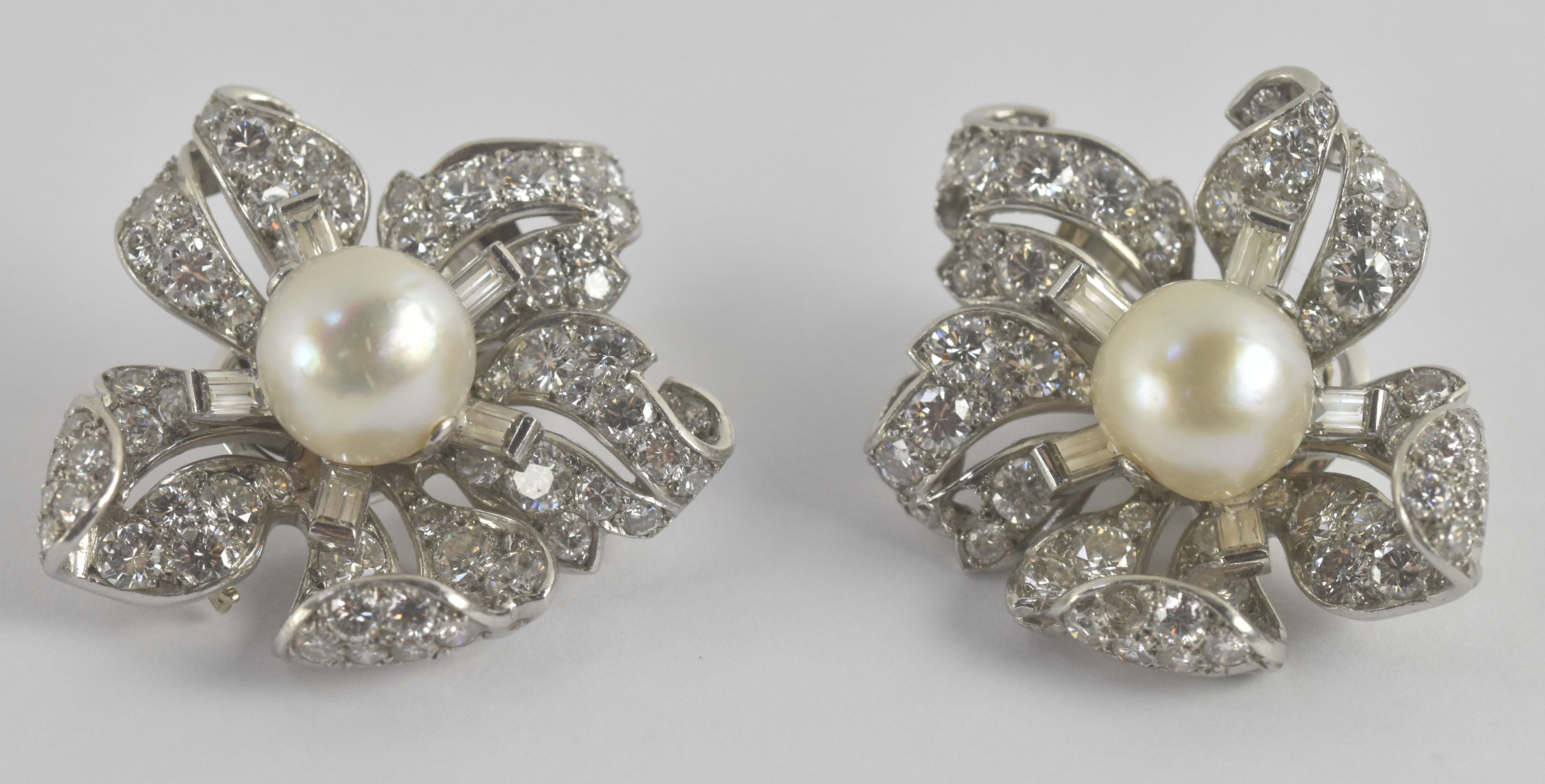 Lot 1286 A pair of white metal diamond and cultured pearl flower head clip-on earrings, sold for £45,500